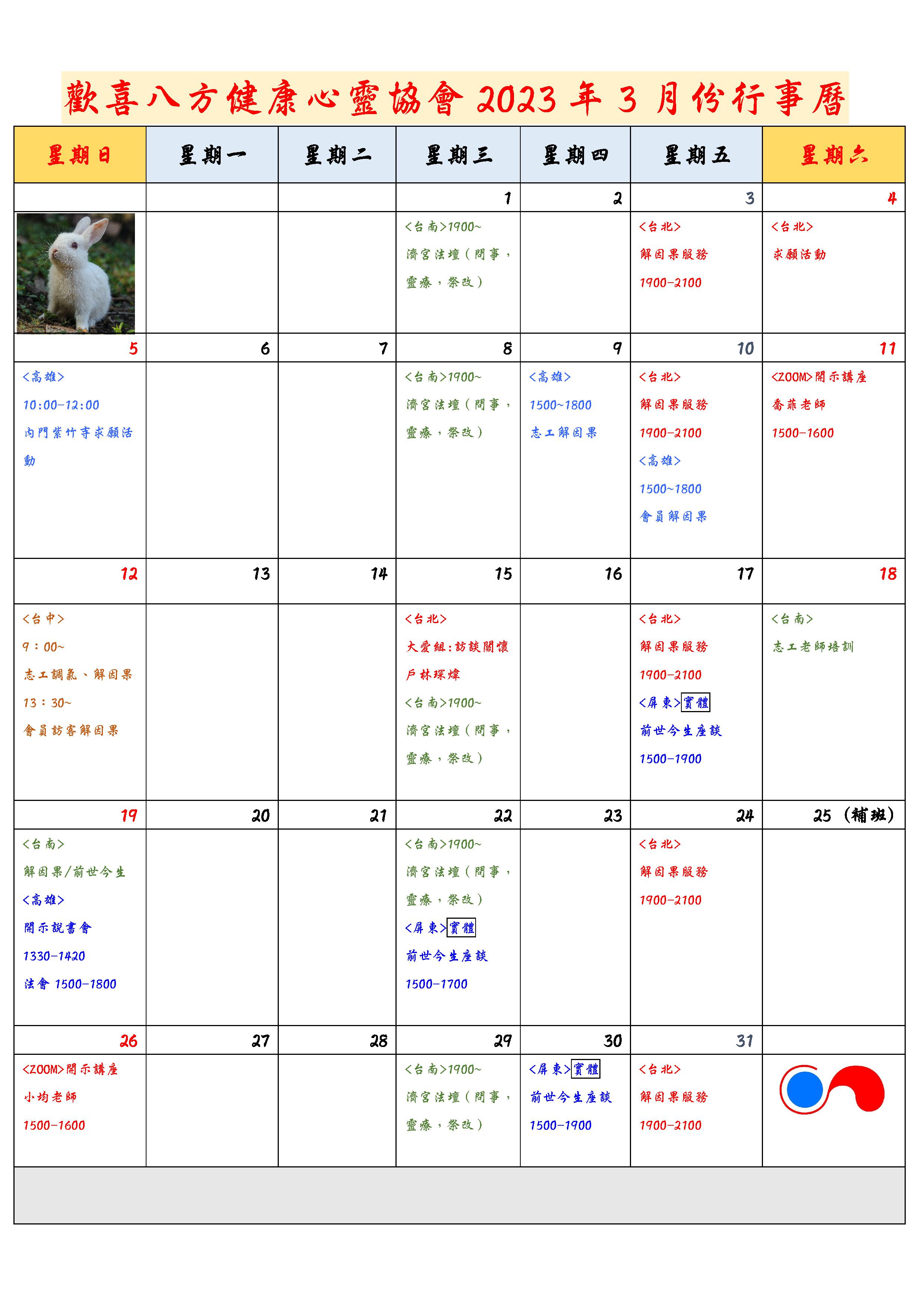 2023年3月份行事曆