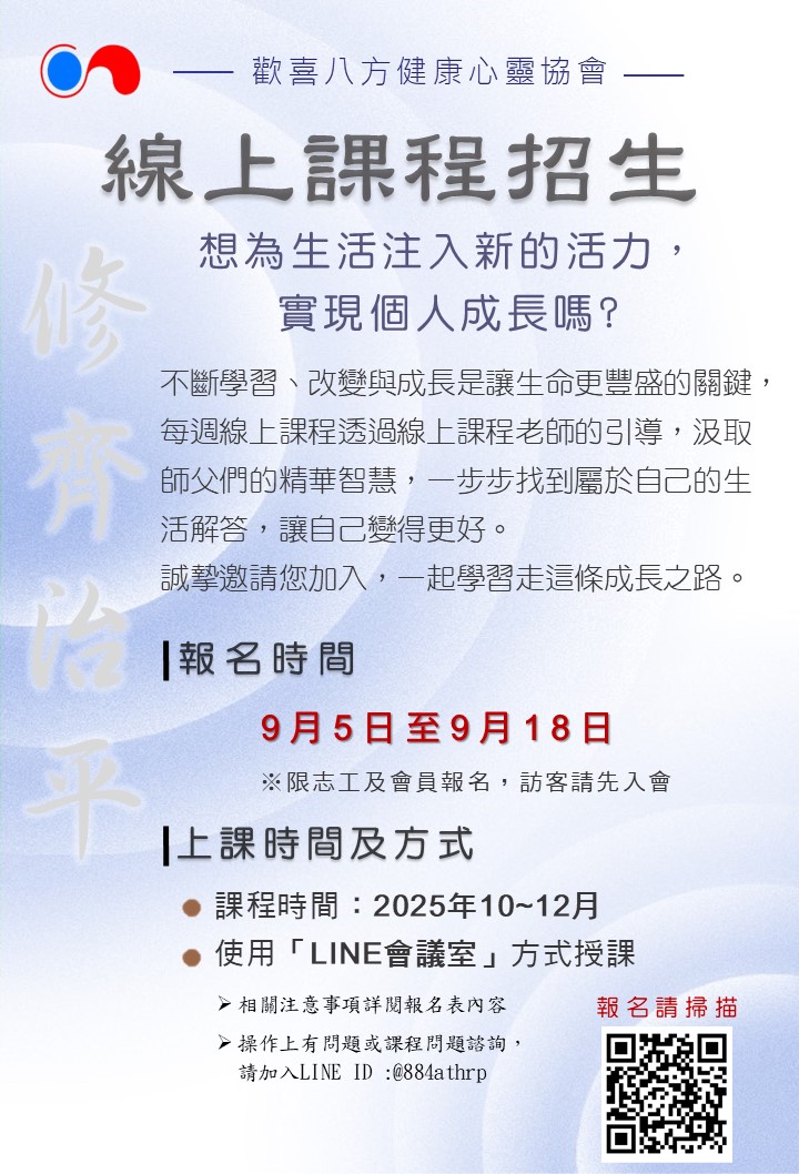 在人生旅途中,不斷學習、改變與成長,是邁向豐盛與美好的關鍵。透過每週線上課程,在老師的引導下汲取師父們的智慧,您將一步步找到屬於自己的答案,學會用新的角度面對生活的挑戰,並讓自己逐漸蛻變、更加美好。這不僅是一門課程,更是一段陪伴與啟發的旅程。誠摯邀請您加入我們,一起走上自我成長的道路,讓心靈充滿力量與喜悅。誠摯邀請您加入,一起學習走這條成長之路。