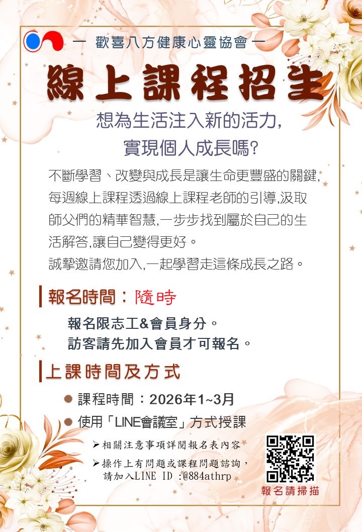 2026年第一季1~3線上課程報名 成長來自於不斷的學習、改變與進步 誠摯邀請您加入線上課程,一起學習、共同成長進步。 ※報名時間:隨時 ※報名連結:https://forms.gle/6dGpt7MVk7zdvnT96 限志工及會員報名,訪客請先加入會員。 相關注意事項詳閱報名表內容