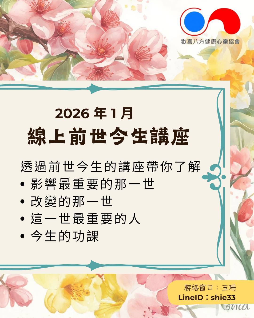 【2026年1月份】線上前世今生講座 <智慧語錄40條:我們要學習五倫關係圓滿,學習做到真正的開心。> 人生在世,歸納而言,就是與兩種人相處,一是自己,一是他人。 藉由前世今生的講座帶你了解 影響最重要的那一世 改變的那一世 這一世最重要的人 今生的功課 報名網址:https://gamma.app/docs/-oy6dqiaj5kjbjnu?mode=doc 歡喜八方 官方網站 https://www.8fung.com 歡喜八方官方line:@884athrp
