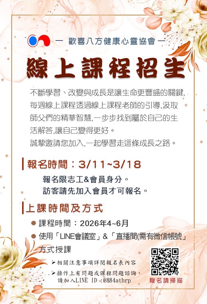 ☀2026年第二季4~6線上課程報名☀ 成長來自於不斷的學習、改變與進步 誠摯邀請您加入線上課程,一起學習、共同成長進步。 ※報名連結:https://forms.gle/mR3UhPBz9YredV36A 限志工及會員報名,訪客請先加入會員。 相關注意事項詳閱報名表內容